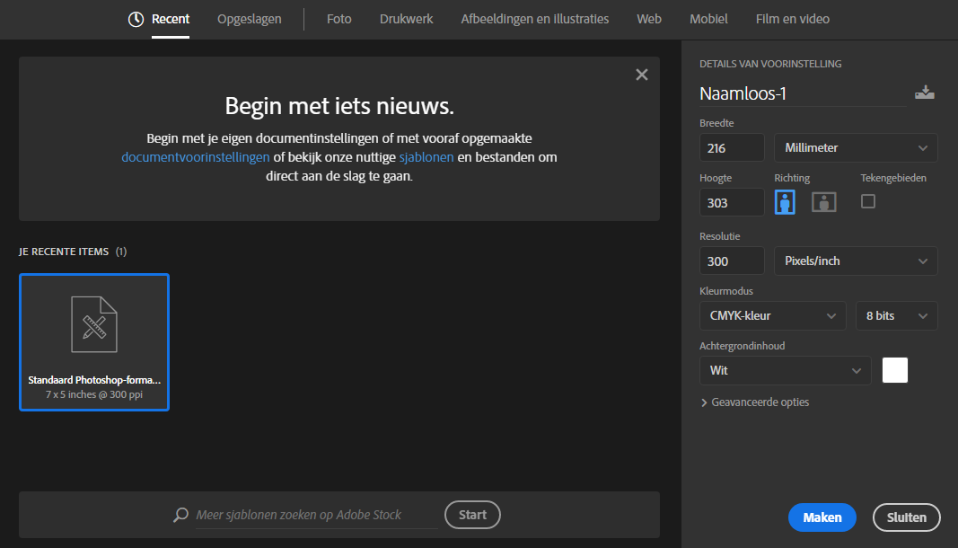 De eerste stap is het aanmaken van een bestand. Dit is meteen één van de belangrijkste stappen. Maak een bestand aan in mm's of cm's. Zo weet je zeker dat de verhoudingen overeenkomen met het drukwerk wat je wilt bestellen. Je begint met het invoeren van de juiste afmetingen. In tegenstelling tot Indesign en Illustrator kun je in Photoshop bij het aanmaken van een nieuw bestand geen afloop aan het document toevoegen (afloop hebben we nodig om het document netjes te kunnen snijden, zodat je geen witranden krijgt). Je dient deze dus meteen al bij het aanmaken van jouw canvas in Photoshop hiermee rekening te houden, zoals in onderstaand voorbeeld.